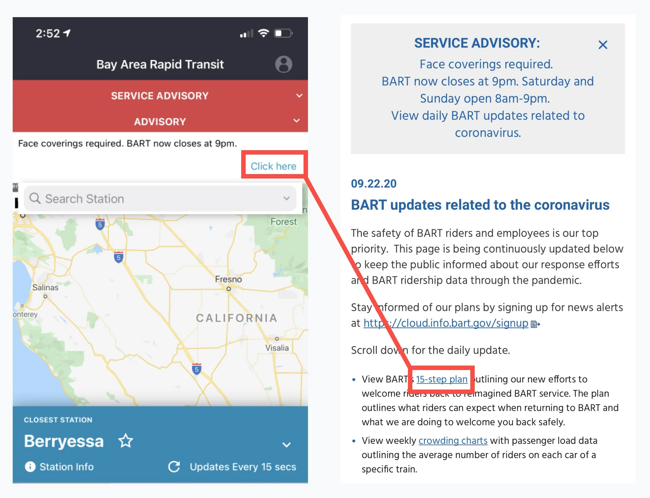 Since the majority of our surveyed riders used the BART mobile app as their primary source for trip planning, I performed a heuristic evaluation on the mobile experience, which revealed significant challenges finding and interpreting safety information.