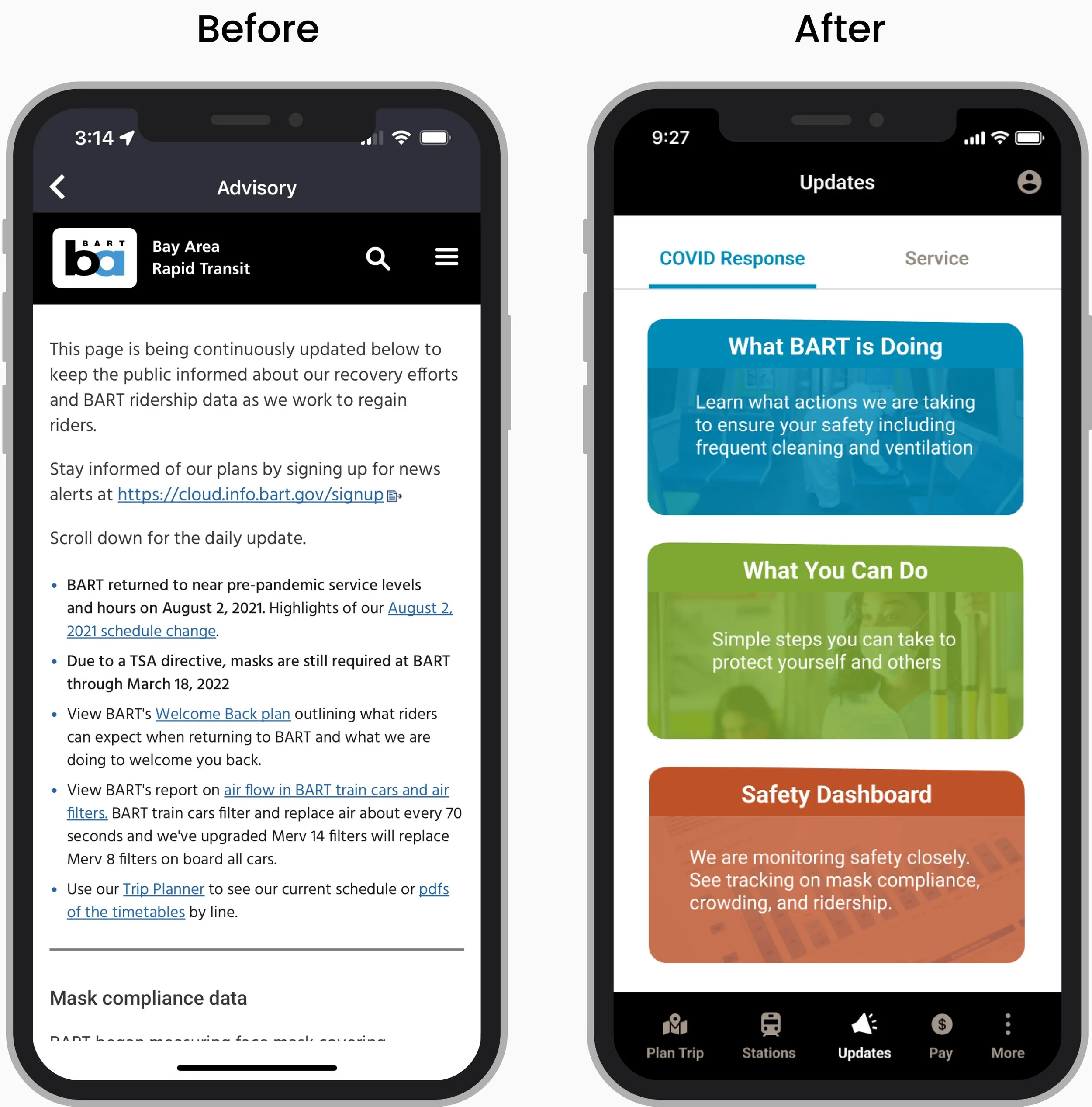 Even though this was a short project, we made good progress towards understanding BART’s ridership challenges and proposing viable solutions. If given more time, I would love to continue to test and iterate my hi-fidelity designs and encourage BART to adopt some of our easier to implement ideas. Simple changes like improving banner visibility and language could go a long way in ensuring people are aware of all of the measures BART is taking to keep riders safe and in turn, improve their ridership numbers. I’m grateful to Alicia Trost, BART’s chief communications officer, for spending the time to give us the insider perspective. Her insights heavily influenced our project scope and direction.