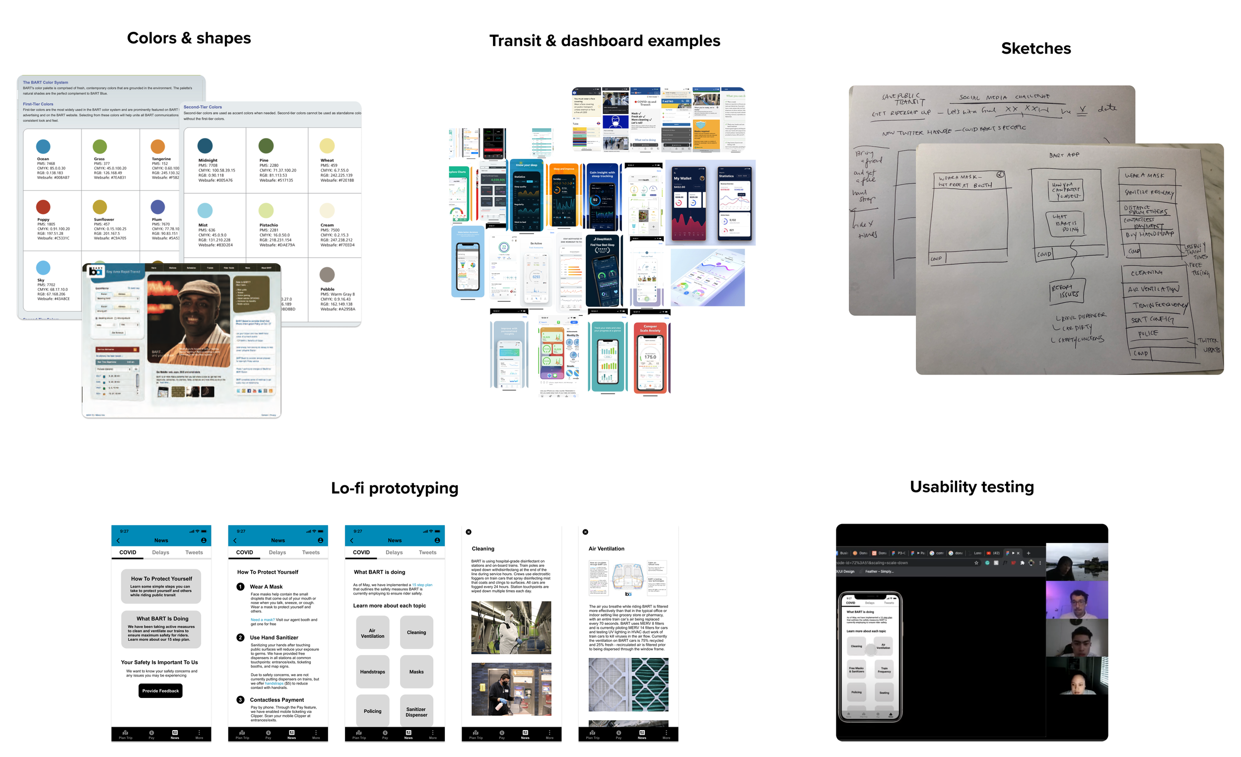 For inspiration, I looked at popular transit and health tracking apps to see how safety information and data trends were communicated. Ideas were then sketched, converted to lo-fidelity prototypes, tested on users, and iterated. When converting to high-fidelity, I followed the official BART brand book closely utilizing their color, font, and shape guidelines.