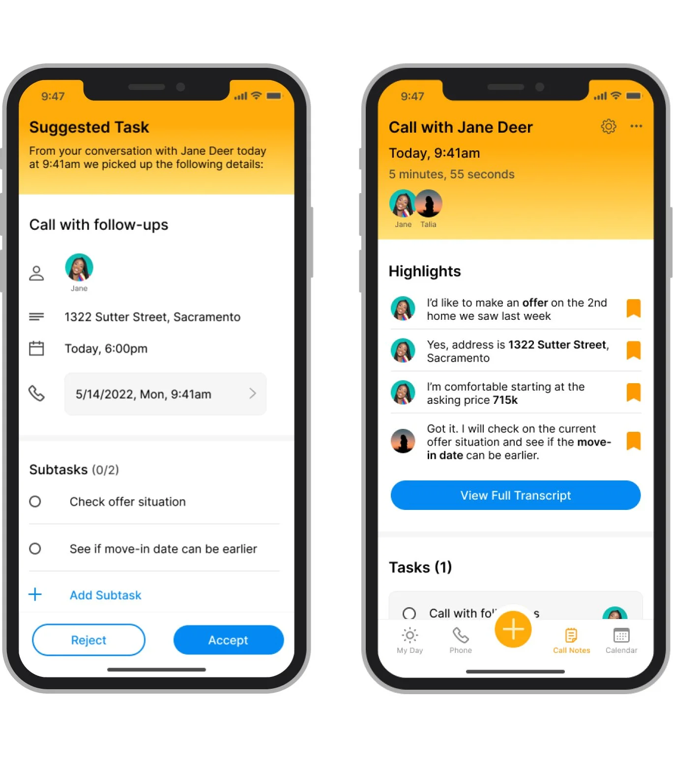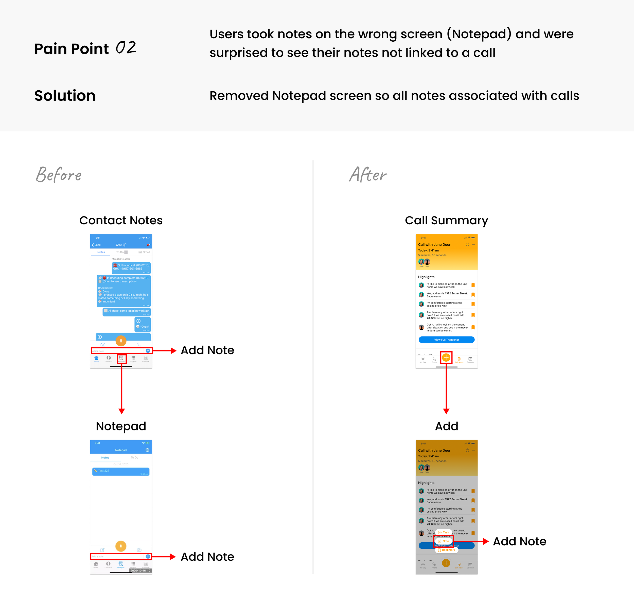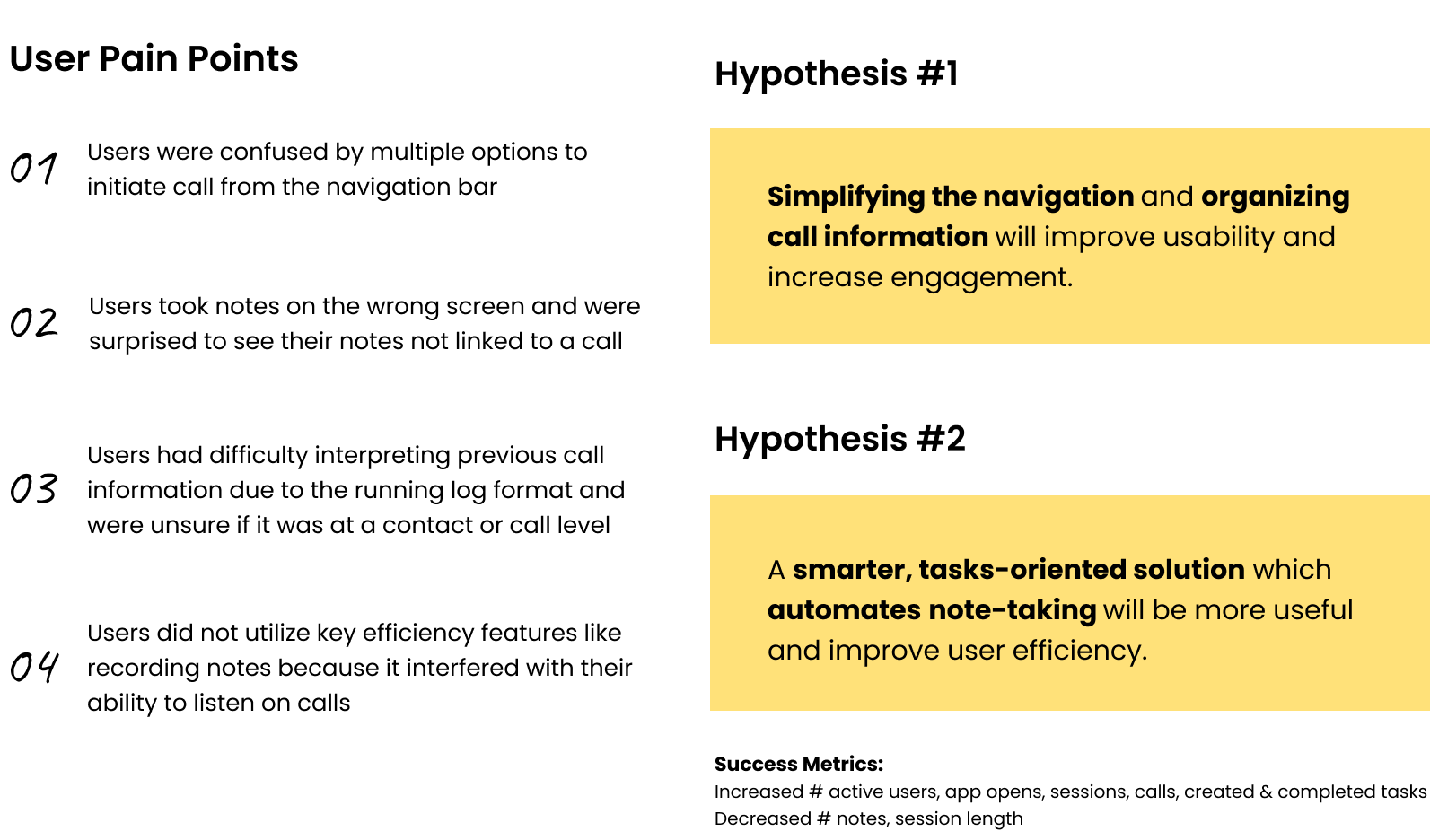 During testing users avoided voice notes, a feature that was intended to make note-taking easier. Users felt that recording notes on calls interfered with their ability to listen and was redundant since the call was being recorded and transcribed. I believe automated tasks and call highlights will resonate more with users as it simplifies their workflow and makes note-taking optional.