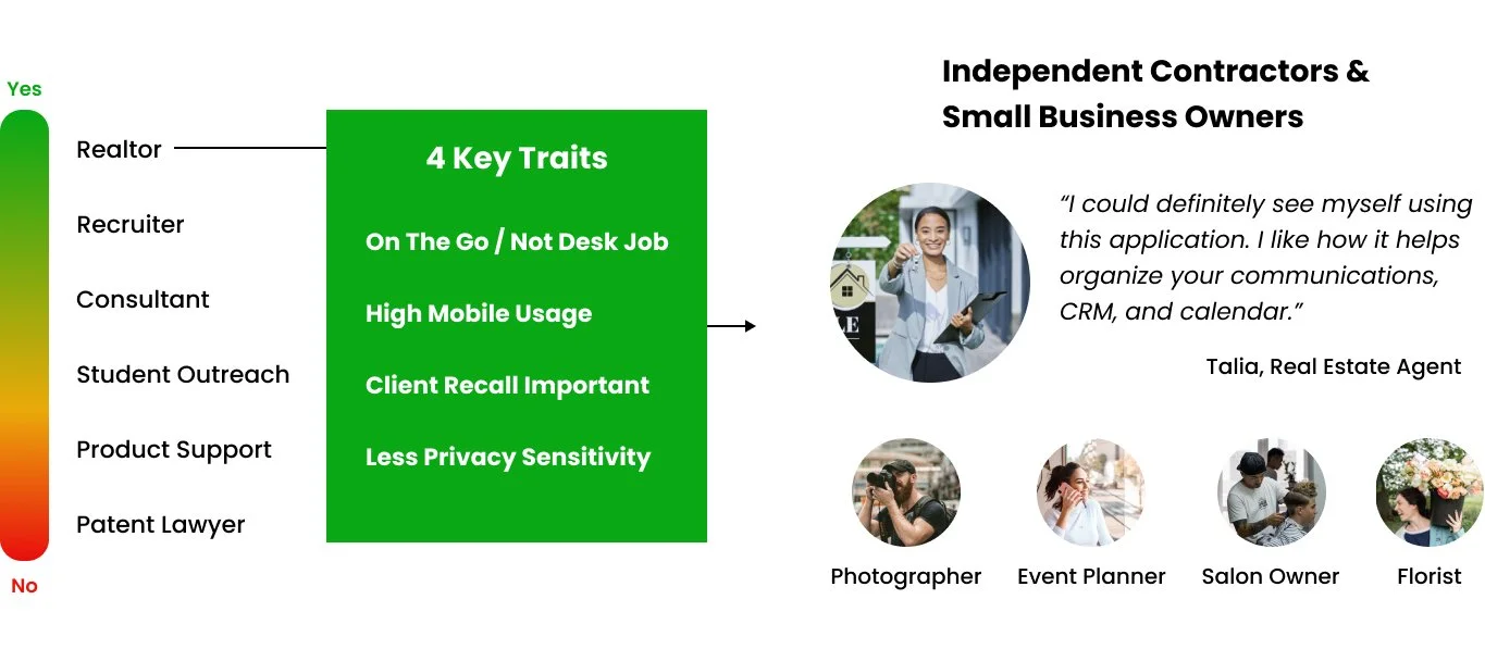 Out of all of the professions we interviewed, the realtor was the most promising. We identified 4 key traits that increased likelihood to use the application and advised Phoenic to target independent contractors and small business owners. After synthesizing our interview insights, I built a target user profile: