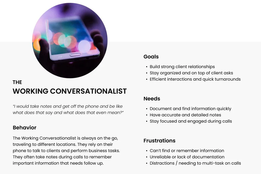One of the first questions we wanted to answer was who was the user of this application? The Phoenic team had reached out to sales people but did not have a clear customer segment. Therefore, we decided to cast a wide net and interview people who had jobs that involved talking to lots of different people and needing to remember information from calls.