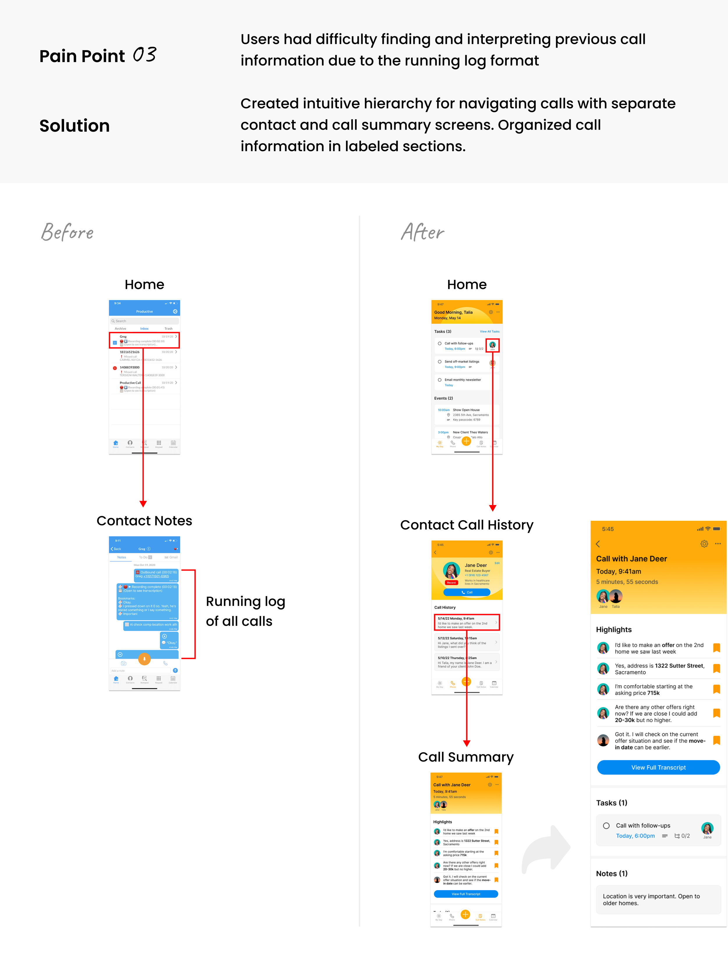I created separate screens at a contact and call level and organized call information into clearly labeled sections for easy readability.