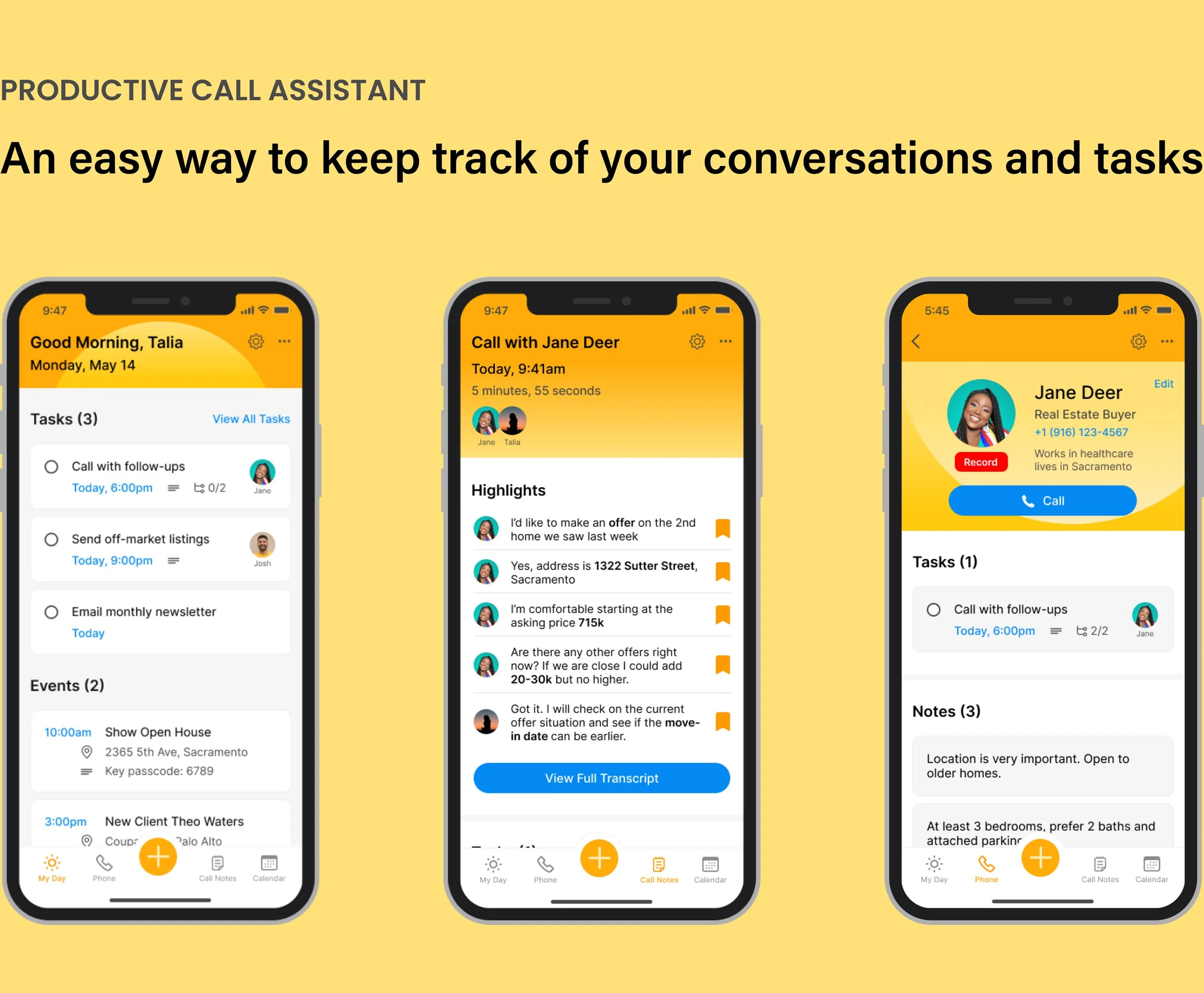 Productive Call Assistant was created by Phoneic, an early stage startup in Silicon Valley. Phoneic’s mission is to empower productivity by making it easy to work while on the go. They envision creating an all-in-one workspace on the phone where important information from calls are stored and easily accessible. In their beta application, they included features for call recording and transcription, voice notes and tasks, and CRM logging.